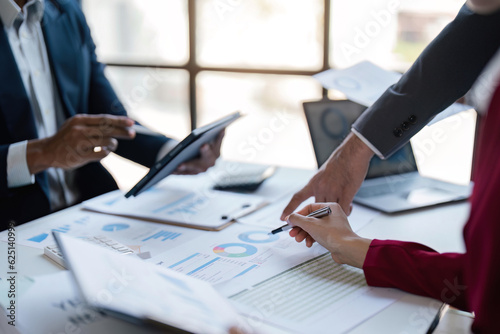 Business team meeting to conference, collaboration discussing working analyzing with financial data and marketing plan strategy project