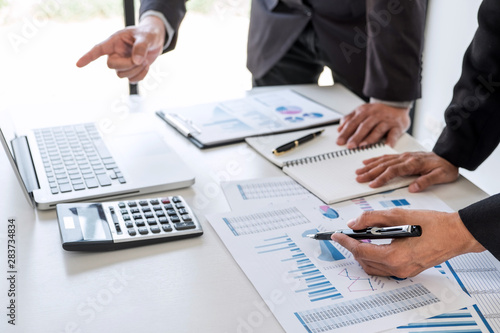 Business team partner meeting working and negotiation analyzing with financial data and marketing growth report graph presentation in team, Meeting Talking Brainstorming Communication Concept