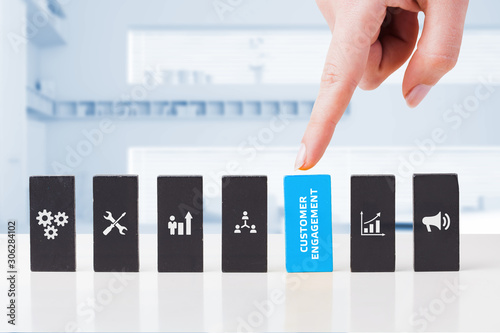 Business, Technology, Internet and network concept. Young businessman chooses domino with the inscription: Customer engagement
