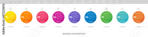 Business vector infographic design template. Circle timeline with icons and 9 nine arrows or steps. Used for process diagram, presentations, workflow layout, info graph, banner, flow chart