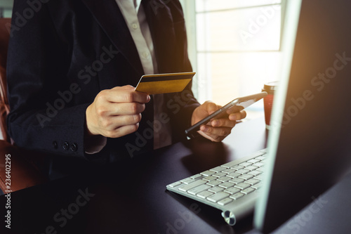 Business woman hands using smartphone and holding credit card with digital layer effect diagram as Online shopping concept