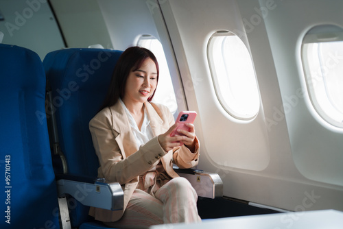 Business Woman on Airplane: A young and stylish businesswoman in a beige suit and patterned blouse sits by the window of an airplane, scrolling through her phone with a smile. She exudes confidence a