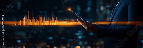 Businessman Analyzes Ascending Financial Bar Graph Displayed on Tablet In Front of Cityscape