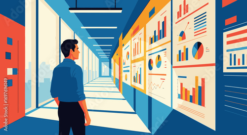 Businessman analyzing data visualization charts and graphs on a wall in a modern office corridor.