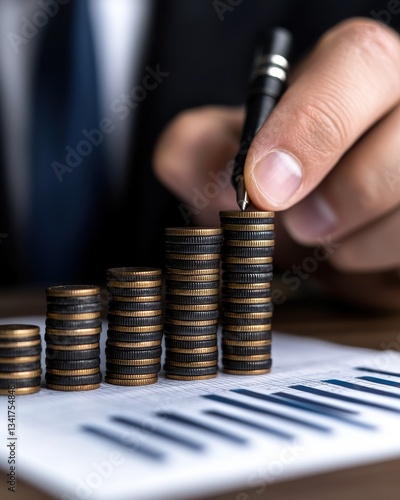 Businessman analyzing financial growth with coins and charts for investment strategies.