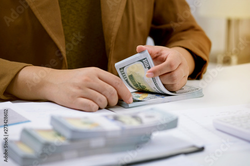 Businessman analyzing investment charts and pressing calculator buttons over documents. Accounting Concept.