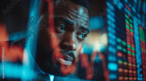 Businessman analyzing stock market data reflecting on glass screen, financial trading