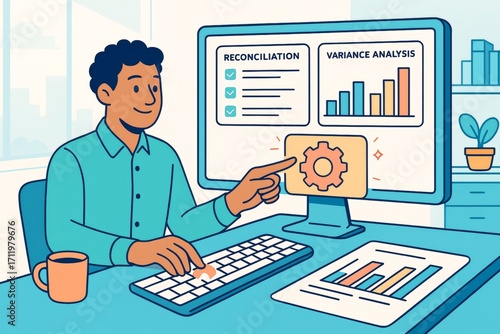 Businessman analyzing variance charts and reconciliation data on desktop in bright office with creative abstract background. Ai generative. Ai generative