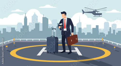 Businessman Awaits Helicopter Departure With Suitcase And Cityscape Background Vector