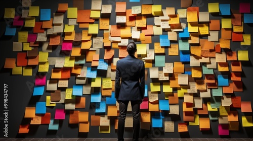 Businessman contemplating post-it notes wall image. Office worker entrepreneur stands in front of large wall filled with colorful sticky notes photography. Organizing ideas concept photo
