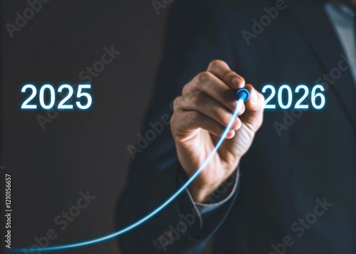 Businessman drawing a graph for 2025 to 2026 on a virtual screen. Business goals and technology concept