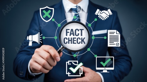 Businessman examines fact-checking interface.
