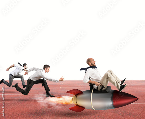 Businessman fly with rocket during a race with opponents