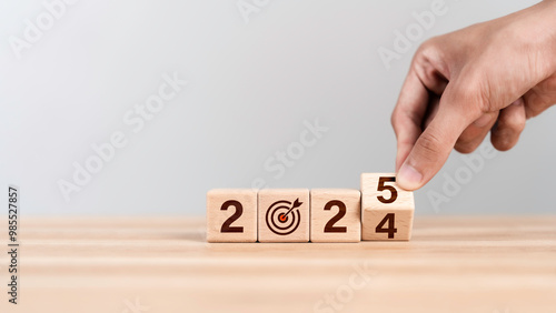 Businessman hand flipping wooden cube from 2024 to 2025. New year resolution, goal, plan, and action concept. target plan and mission annual. Happy new year 2025 background with goal icon.