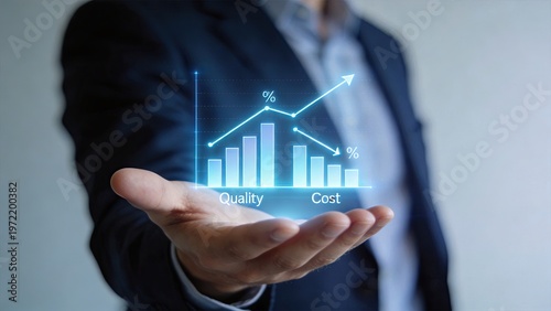 Businessman hand holding futuristic hologram chart showing rising quality and decreasing cost percentage for financial analysis and corporate strategy concept