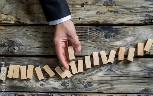 Businessman hand stopping domino effect on dark background. Risk and strategy concept