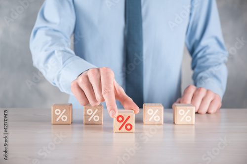 Businessman hand takes a wooden cube block depicting,shown the percentage symbol icon. Interest rate financial and mortgage rates concept.