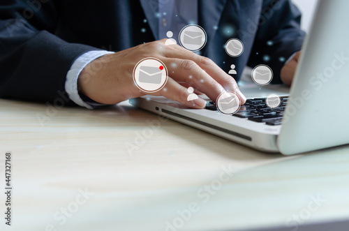 businessman hand typing on laptop keyboard checking email online. business technology on a virtual interface