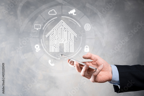 Businessman hold house icon.Smart home controlled, intelligent house, and home automation app concept.Pcb design and person with smart phone. Innovation technology internet Network Concept.
