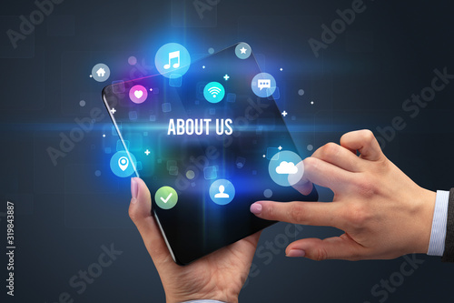 Businessman holding a foldable smartphone with ABOUT US inscription, social media concept