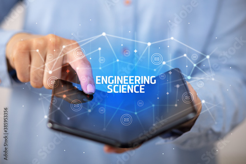 Businessman holding a foldable smartphone with ENGINEERING SCIENCE inscription, new technology concept