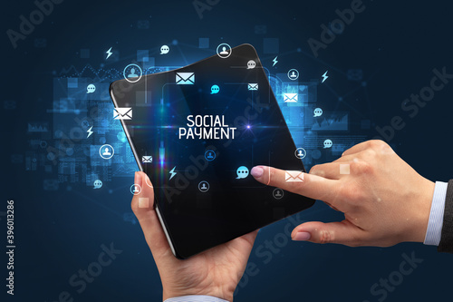 Businessman holding a foldable smartphone with SOCIAL PAYMENT inscription, social networking concept