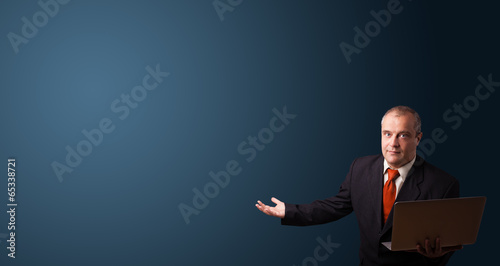 businessman holding a laptop and presenting copy space