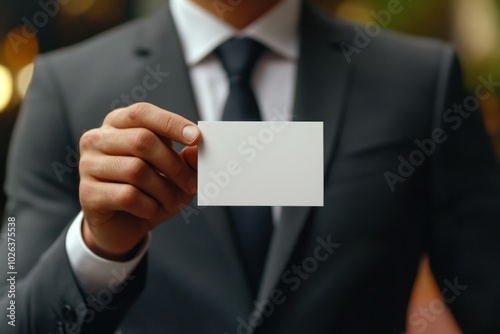 Businessman Holding Blank Card in Professional Setting