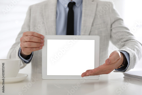 Businessman holding modern tablet with blank screen at white table in office, closeup