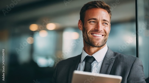 Businessman in a suit stands in a contemporary office, smiling confidently while holding a tablet. The workspace features large windows and a bright atmosphere.