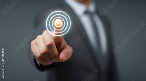 Businessman in Dark Suit Touching Virtual Interface with Orange Light and Circles Indicating Technology and Connectivity Concept in a Modern Office Environment