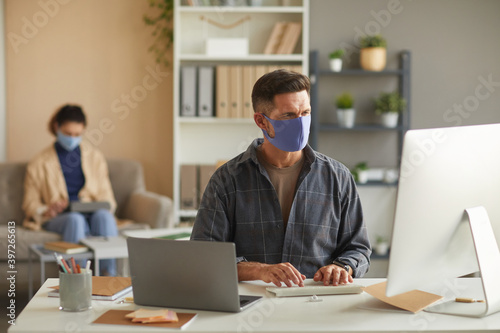 Businessman in protective mask working on computer at his table with his colleague in the background at office