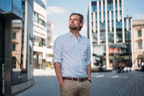 Businessman in the city looking around