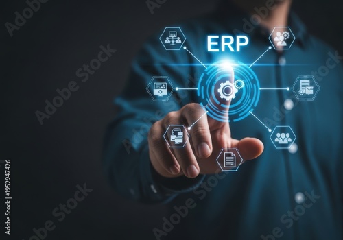 Businessman interacting with erp software system on dark background