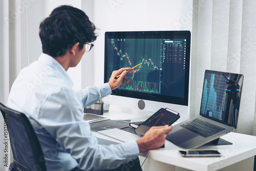 Businessman investor working with computer, tablet and analyzing graph stock market trading planning with chart data financial investment planning
