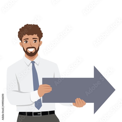 Businessman is holding an arrow pointing to the right, suggesting direction or guidance. Flat Vector character illustration