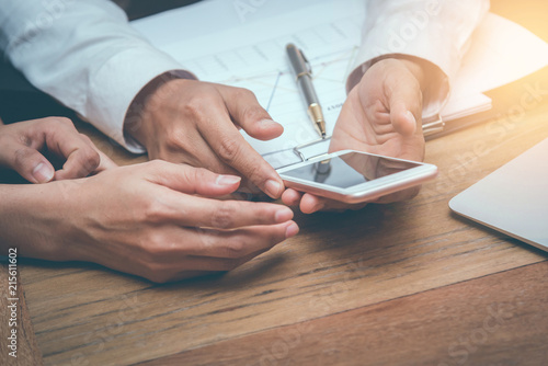 Businessman playing phone to check the profits of the company. The desk he filled with documents and concept of the partners.