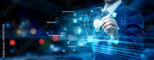 Businessman pointing at digital solutions technology on futuristic interface screen, business optimization system, enterprise problem-solving platform, tech innovation concept