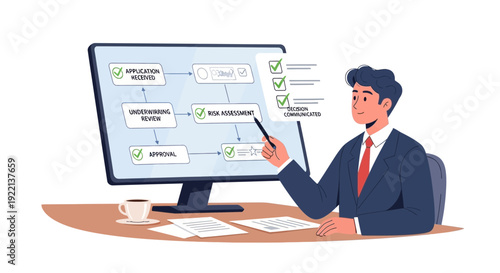 Businessman presenting business process flowchart on computer screen