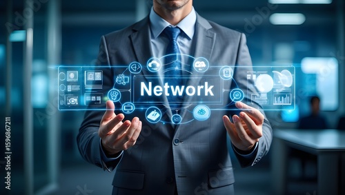 Businessman Presenting Futuristic Network Technology Interface: Global Connectivity, Data Analysis, Cloud Computing, Modern Business Concept.