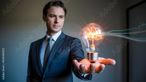 Businessman Presenting Glowing Idea, Innovative Solution Concept