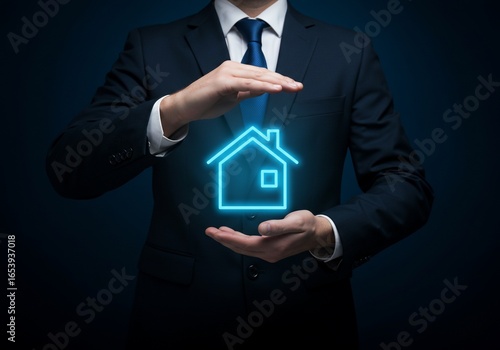 Businessman Protecting a Glowing Blue House Icon: Home Security and Real Estate Concept