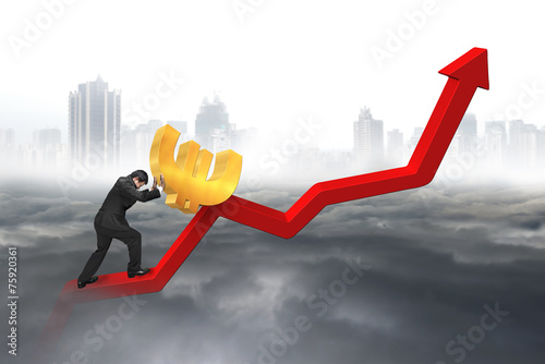 businessman pushing euro at trend chart starting point with city