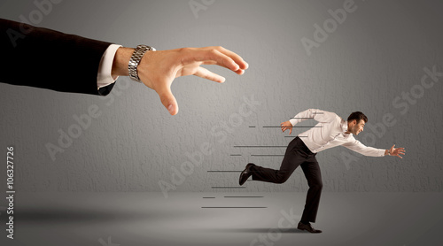 Businessman running away from a huge hand