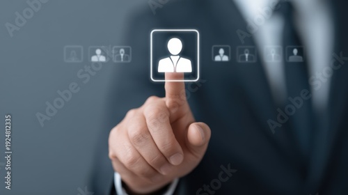 Businessman Selecting Candidate Profile on Digital Interface for Executive Recruitment Process