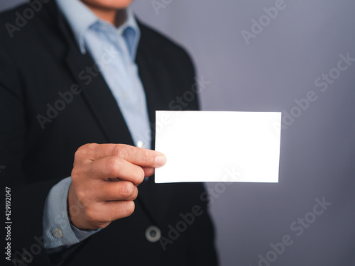 Businessman showing a blank white business card while standing with a gray background. Close-up photo. Space for text. Business and contact concept