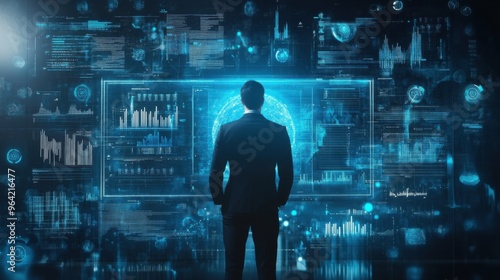 Businessman standing in front of a futuristic interface with holographic data. Technology and business concept