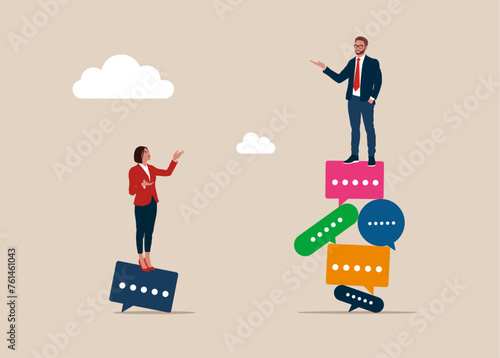 Businessman standing on much more bubble message, woman on one bubble message. Gender gap. Flat vector illustration