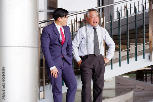 Businessman standing smiling and discussing work in office.