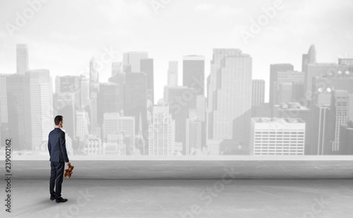 Businessman standing with his back on a roof with objects in his hand